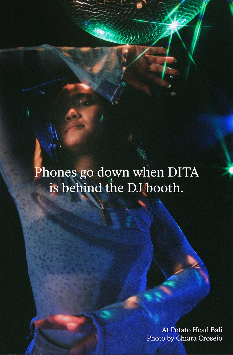 DITA has been cooking her own flavor since day one, developing a sound that pulls from proto-house, ’90s breaks, and disco. What began with her Perky Club collective in Jakarta and Bali quickly turned into a movement, with crowds tapping into her straightforward, no-rules approach behind the decks. From Potato Head (where she has a residency) to Panorama Bar, from Rainbow Disco Club to Wonderfruit, she’s carrying her people’s stories across continents, stitching her multicultural roots into a global sound system. We got to catch up with her, from the Bronx to Bali. This is DITA: clear point of view and talent. No one’s using their phones during her sets.